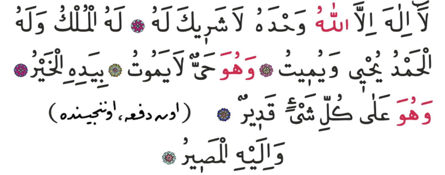 Hamdeleden sonra on defa ism-i a'zam mertebesini taşıyan şu mübarek cümleler okunur: